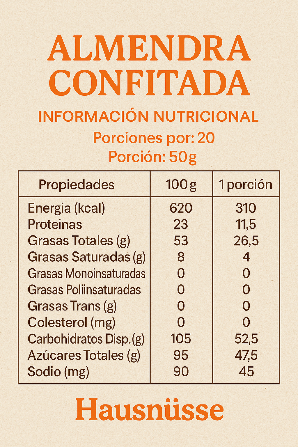 Un manjar exclusivo para los más exigentes paladares. Nuestras almendras confitadas son elaboradas con almendras de la mejor calidad, cuidadosamente confitadas para obtener una textura crujiente y un sabor único y delicado. Perfectas para disfrutar en cualquier ocasión y deleitar a tus sentidos.