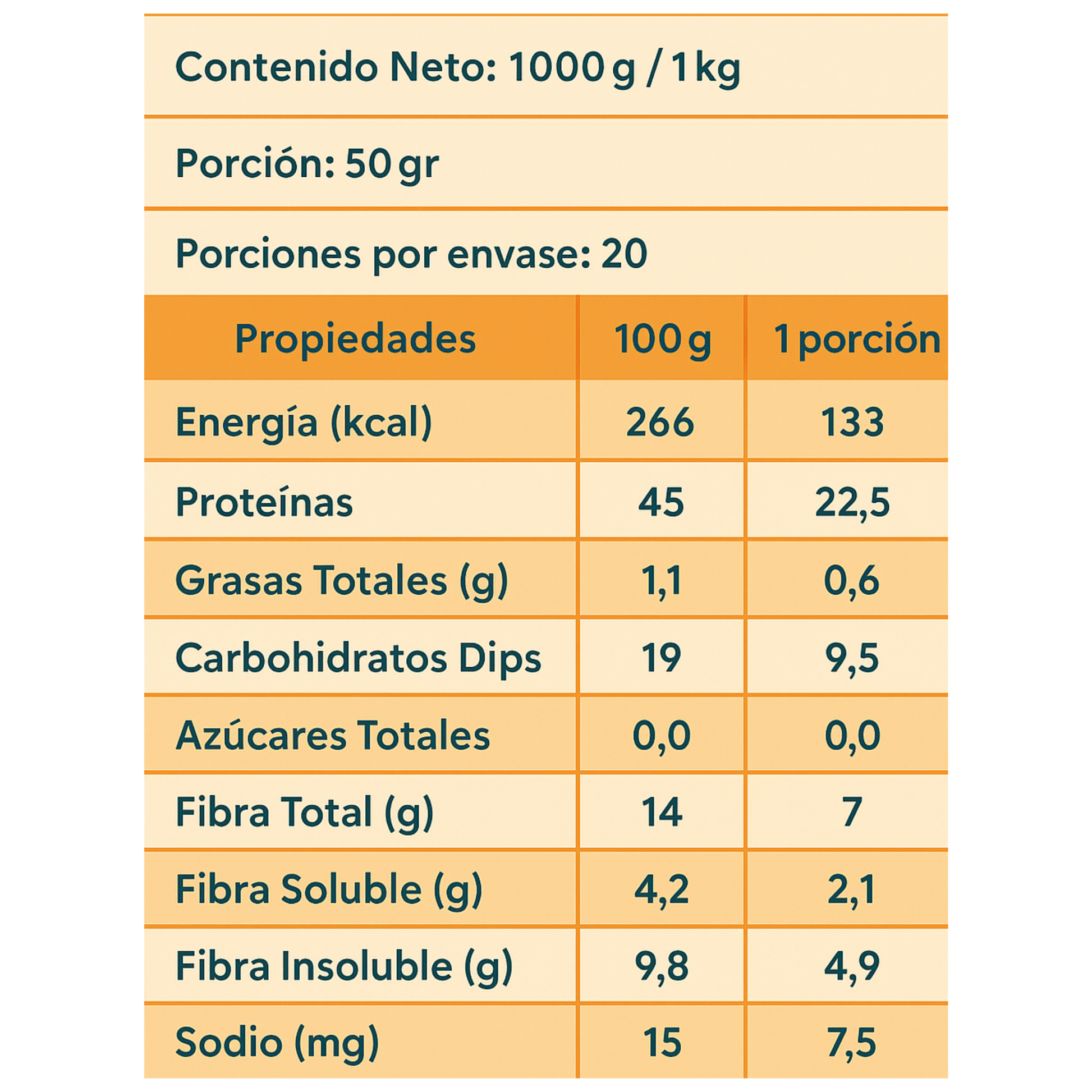 Alimento vegetal deshidratado, de textura fina y rápida hidratación. Aporta 23 g de proteína por porción de 50 g, con alto contenido de fibra y bajo en grasas. Sin azúcar añadida ni ingredientes de origen animal. Ideal para preparaciones veganas, saludables o funcionales.