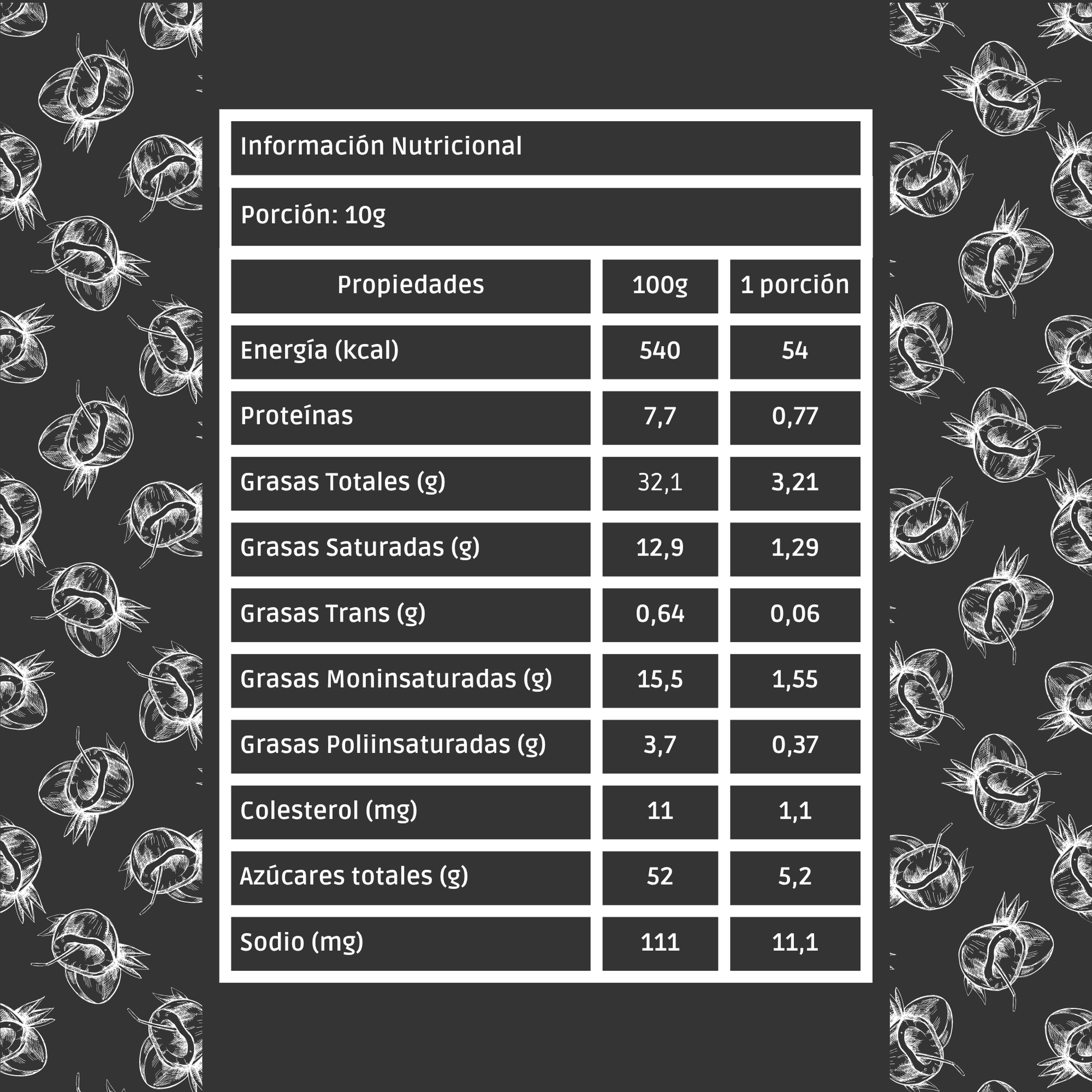 Ingredientes: Coco deshidratado, azúcar, manteca de cacao, masa de cacao, sólidos lácteos (suero y protéinas de leche concentrada), leche en polvo, aceite vegetal hidrogenado (Aceite de Palma), Embulsionante (lecticina de soya y polirricinoleato de poliglicerol), sabores naturales, sal.