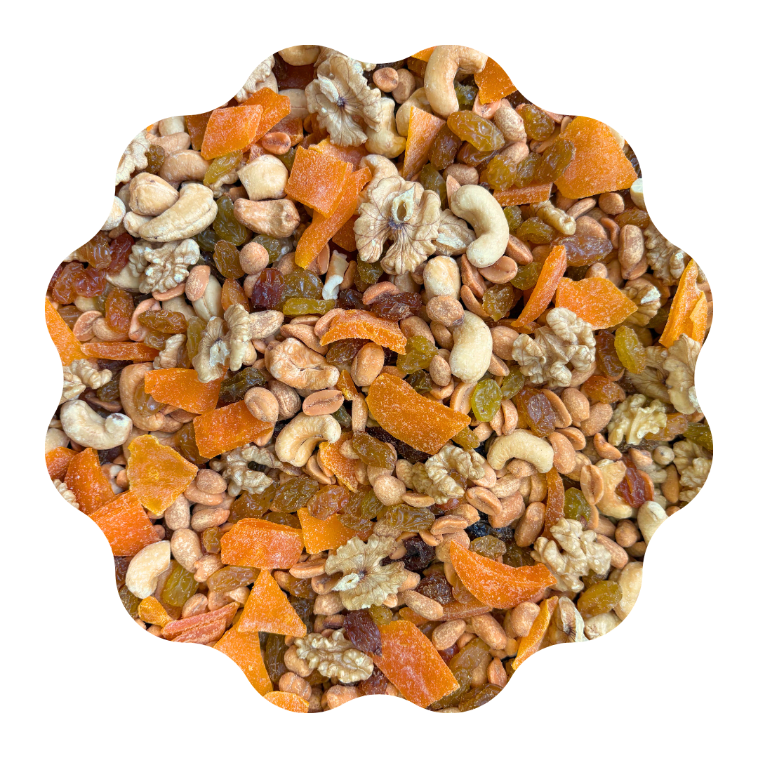 Mix Especial de Hausnüsse contiene pasas rubias, maní con merken, mango, castañas de cajú con sal, nuez mariposa, almendra.
