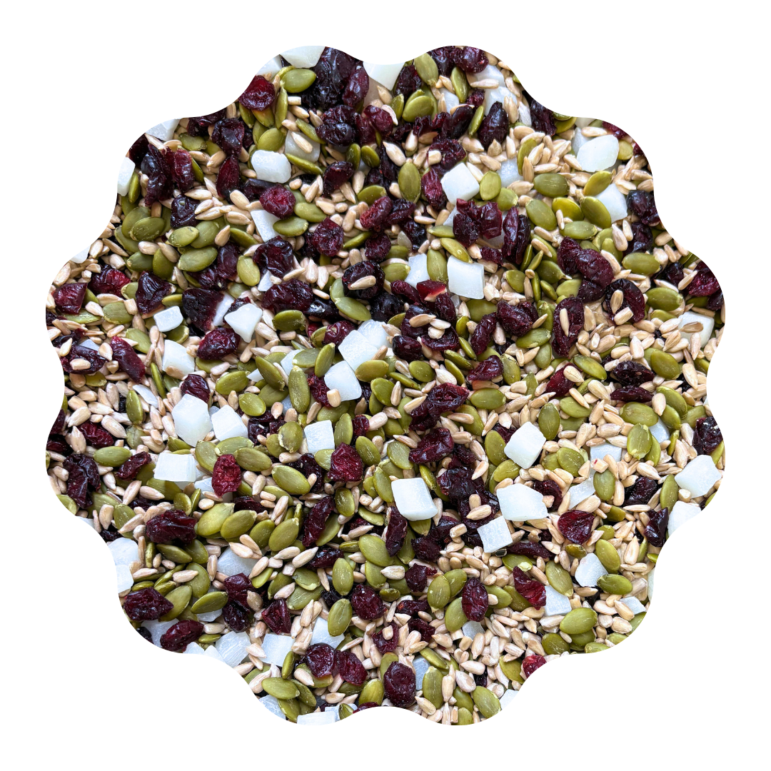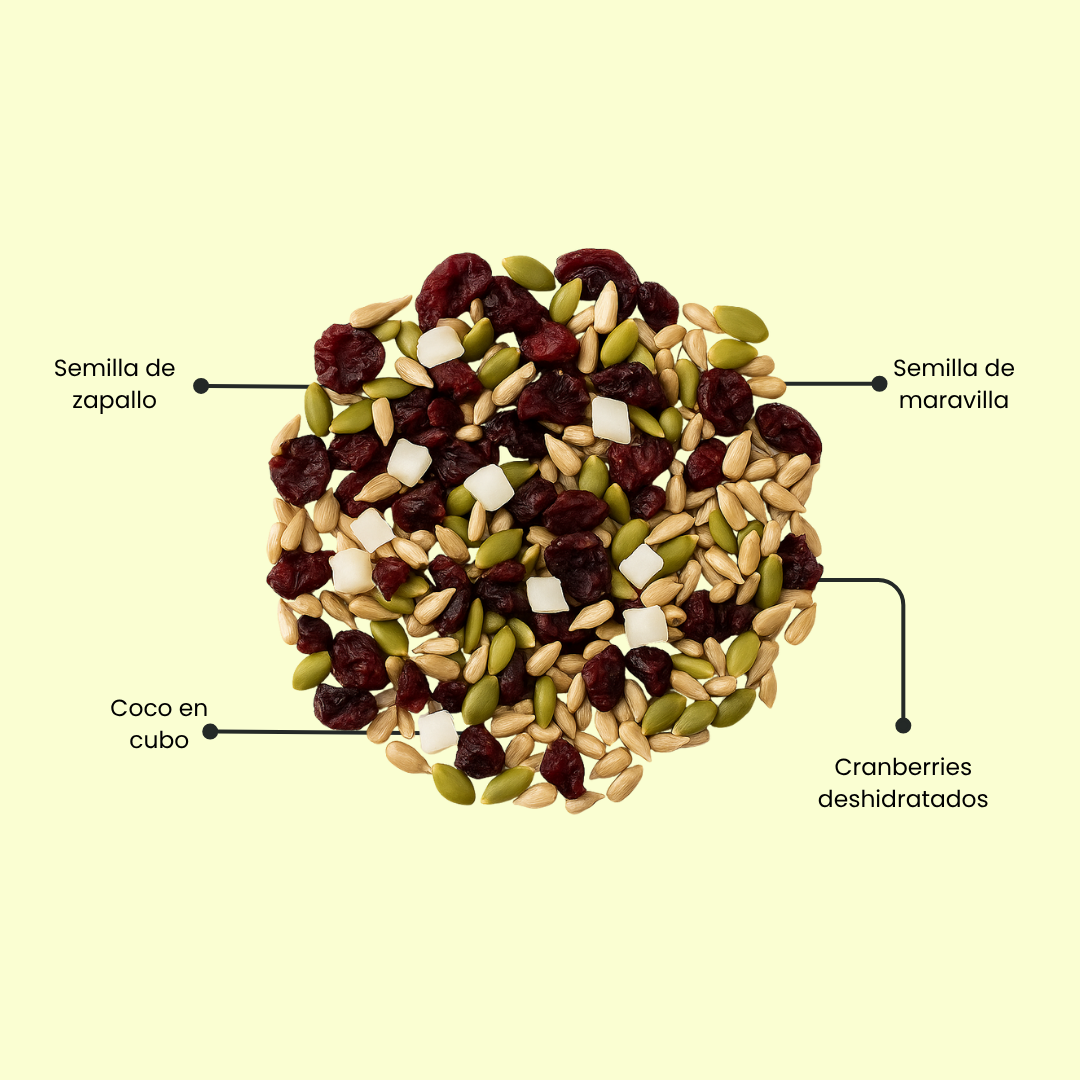 Mix Natural de Hausnüsse contiene coco en cubos, semilla de maravilla, semilla de zapallo y cranberries deshidratados.