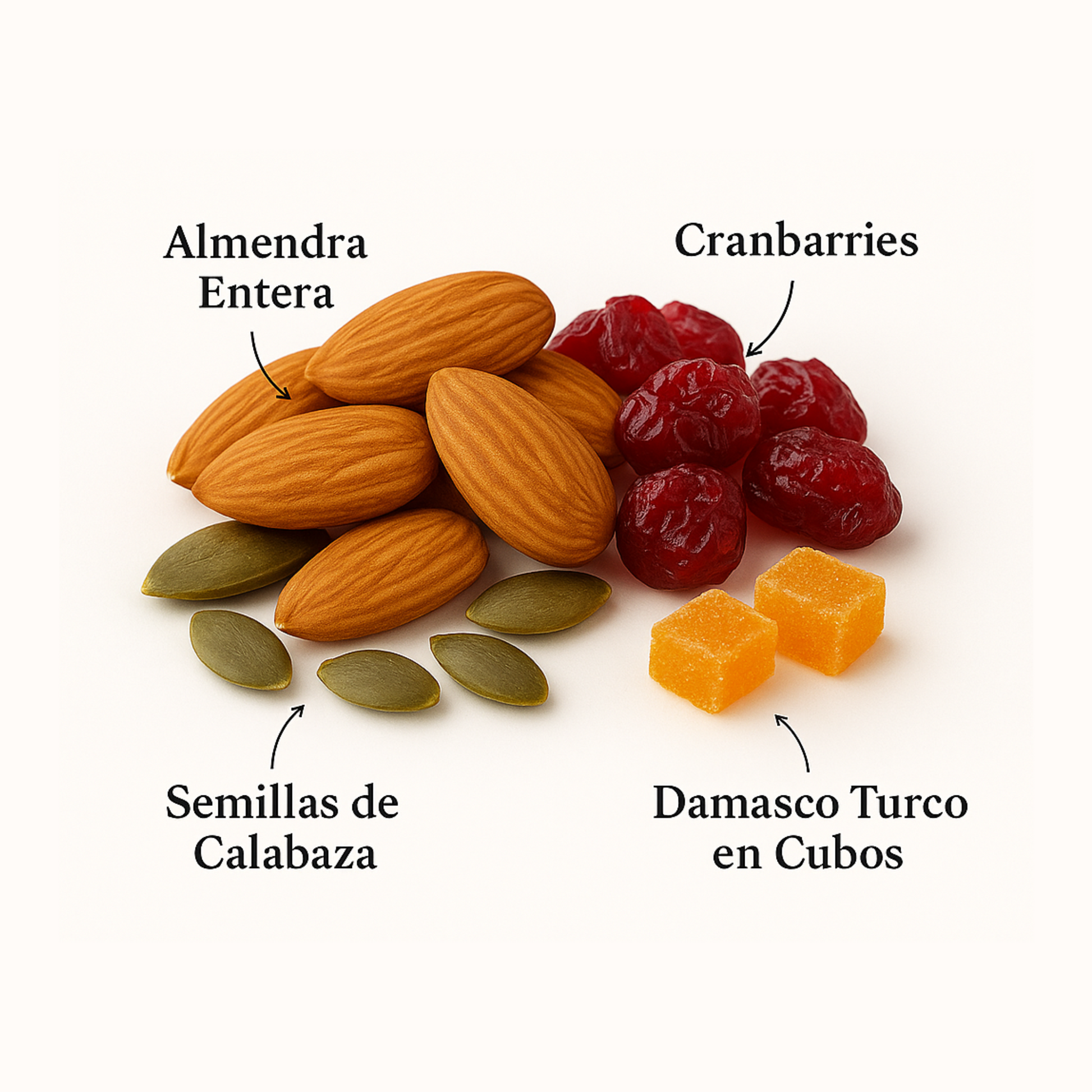 Nuestro Mix premium trae nuestras clásicas almendras acompañadas con semillas de calabaza, cranberries deshidratados y damasco turco en cuadritos