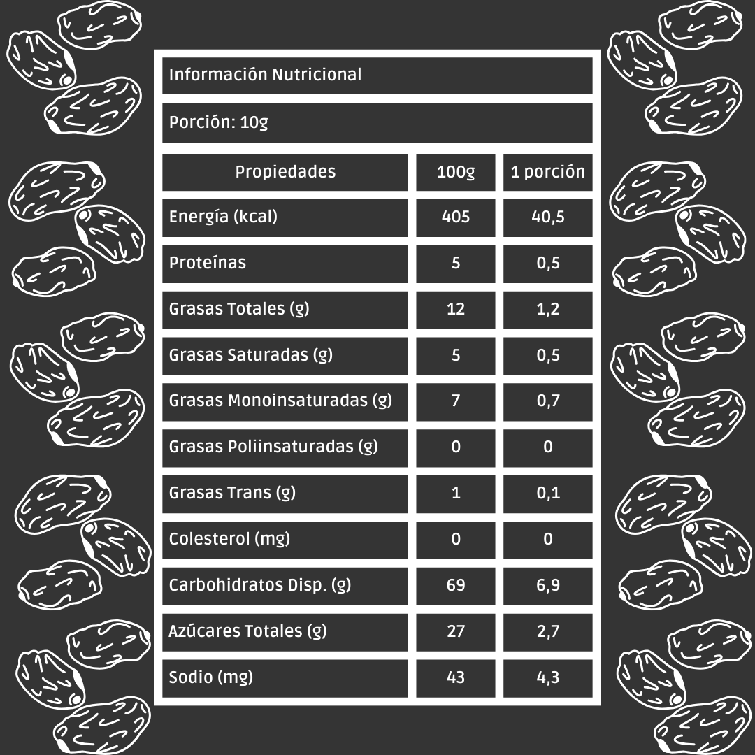 Ingredientes: Pasas, azúcar, manteca de cacao, leche en polvo, sólidos de leche, aceite vegetal, cacao en polvo, alcohol etilico, ron, goma arabica, emulsionantes (lecitina de soya), poliglicerol polimicinoleato,vainilla.